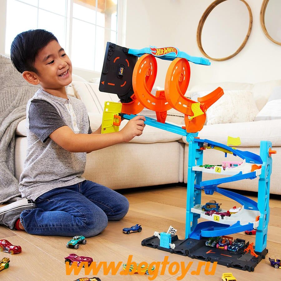 Вот описание для сайта на основе предоставленного изображения гоночной башни Hot Wheels City Transforming: