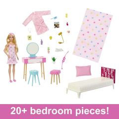 • 15 аксессуаров Barbie® добавляют реалистичности деталям: от элементов декора, таких как повязка на голову и маска для сна, до предметов декора, таких как лампа и растение!